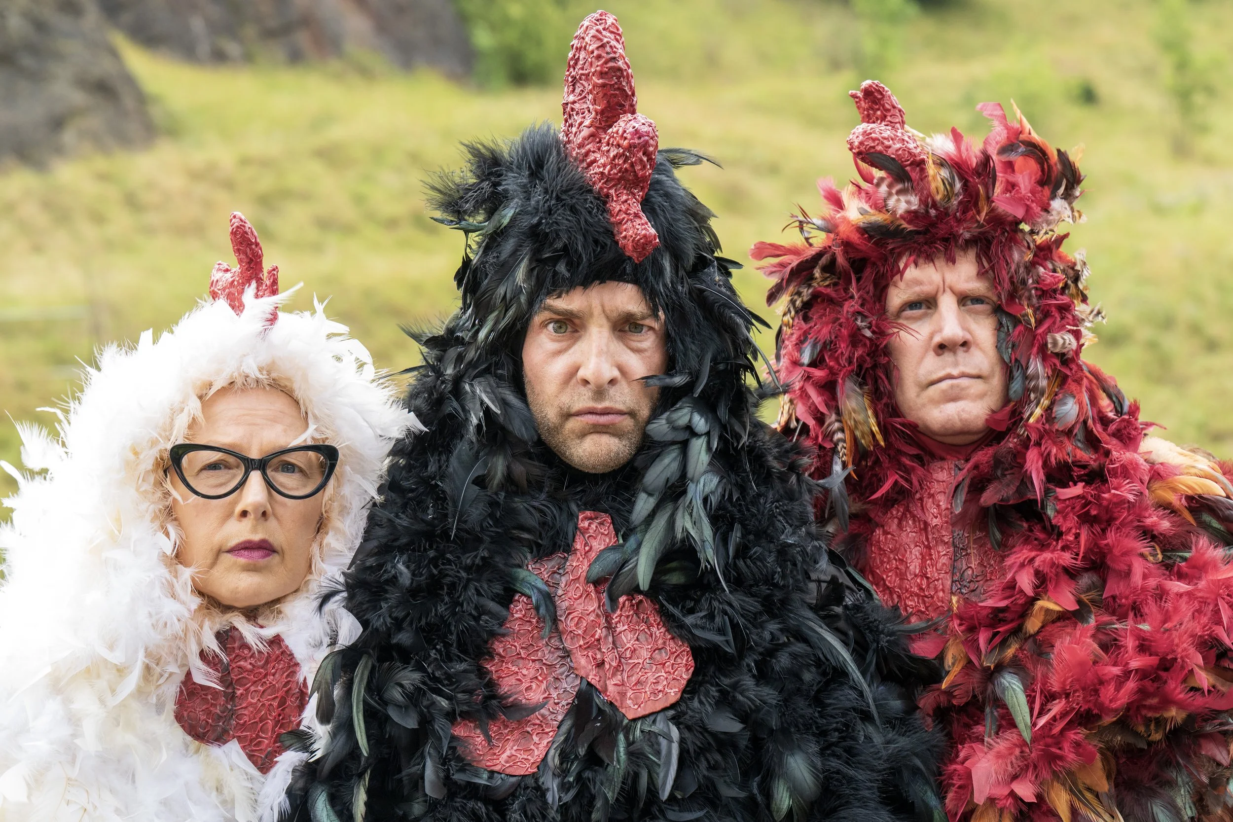 "Three Chickens Confront Existence" is a play exploring existential themes through the lens of three factory-farmed chickens. In this surrealist and hilarious production, these feathered friends passionately explore their impossible situation—awaiting their imminent trip to the broiler.